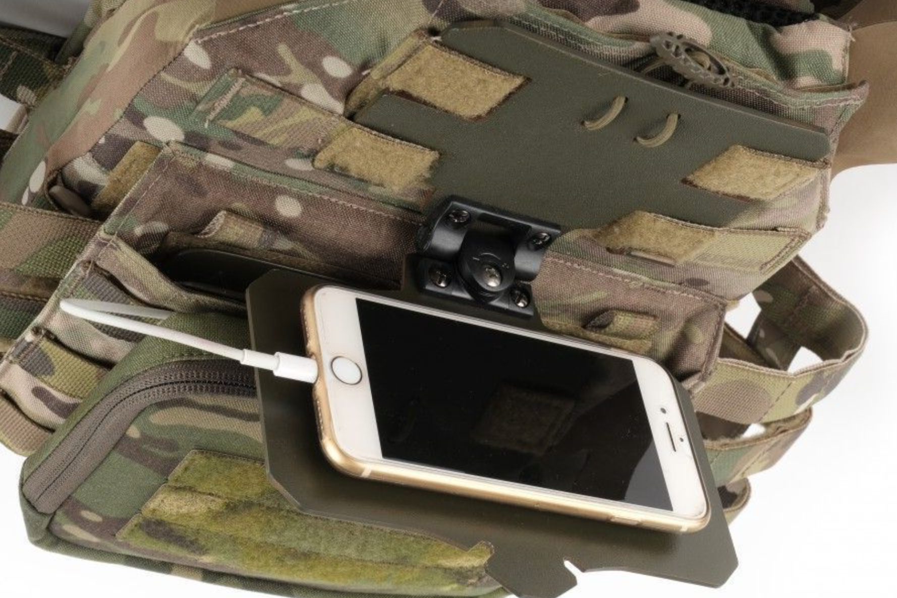 Además, gracias a su bisagra de alta calidad, podrás posicionar el móvil en la posición que prefieras y en la altura de tu chaleco o portaplacas Molle que más te guste.