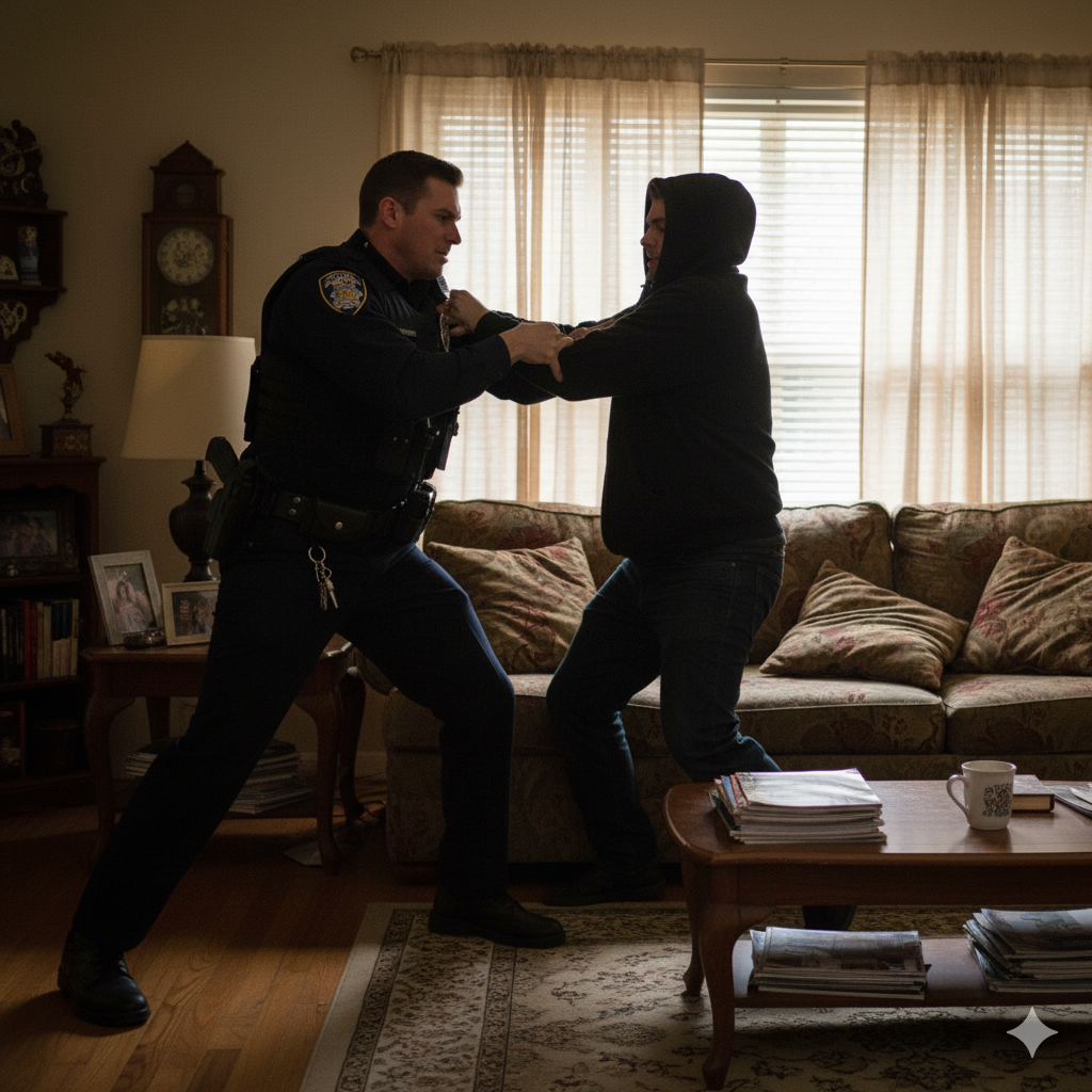 Dos agentes rompieron la puerta de la vivienda. El sargento y el caporal Gaspar penetraron en el piso a la carrera. Gaspar, quien llevaba en su mano izquierda una linterna y en la derecha su pistola reglamentaria sin seguro y en posición de doble acción (con el dedo fuera del gatillo), se encontró en el salón con dos personas, cuya presencia no esperaban.