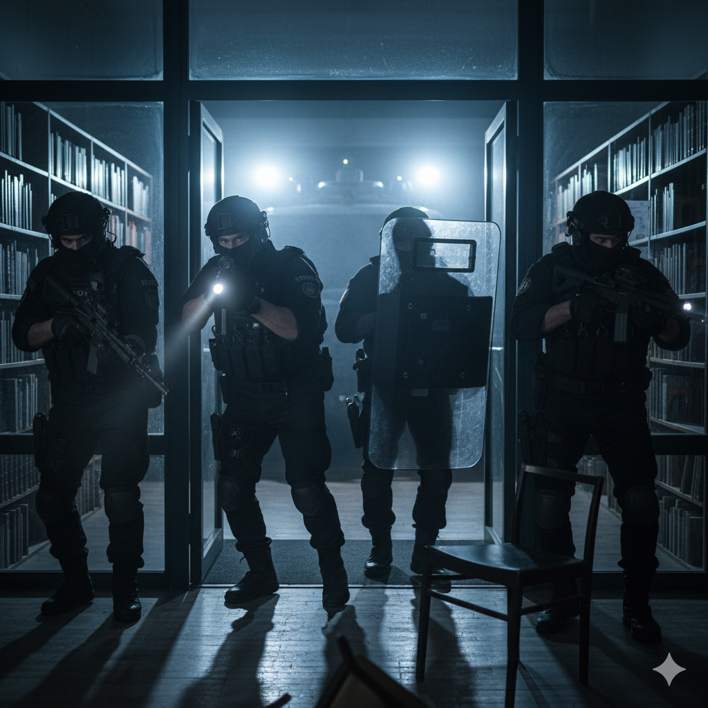 Los tres policías entraron con cascos y chalecos antibalas, pues creían enfrentarse a una amenaza real. Al ver a Luis Carlos, el agente Moisés le pidió que se tranquilizara, pero el hombre se levantó, le apuntó y disparó, forzando al policía a arrojarse instintivamente al suelo.